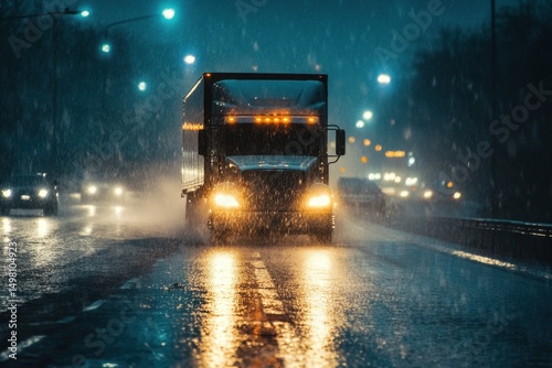 Semi Trailer truck navigates wet highway during heavy rain at night, A semi-trailer truck drives on a wet highway in heavy rain