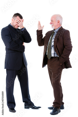 Senior and junior handsome business people discussing. Isolated on white bacground