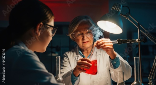 Senior female scientist and young assistant conducting a chemical experiment in a dark laboratory