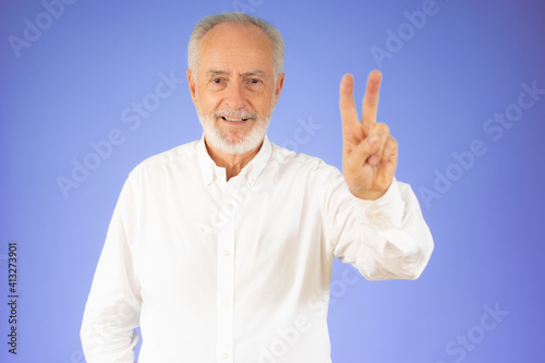 Senior grey-haired man wearing casual shirt standing over isolated violet background smiling with happy face looking at the camera doing victory sign with fingers. Number two.