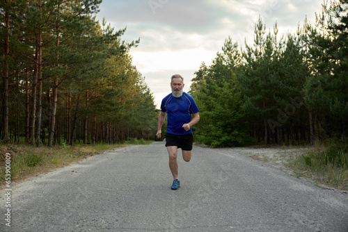 Senior man jogger performing exercise outside among countryside road
