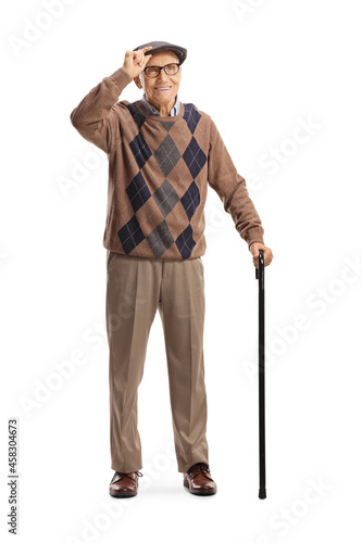 Senior man with a walking cane greeting with hat