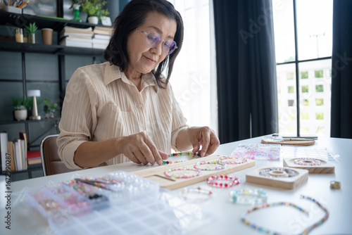 Senior mature older asian woman Art hobby handmade making beads jewellery accessories handcraft hobby