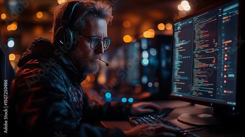 Senior programmer wearing headset coding on multiple monitors in modern office environment. Concept of software development and remote work