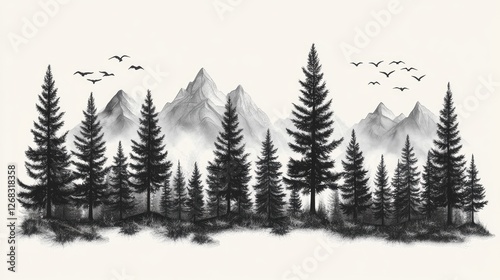 Serene black and white forest landscape with mountains and birds, perfect for nature-themed decor