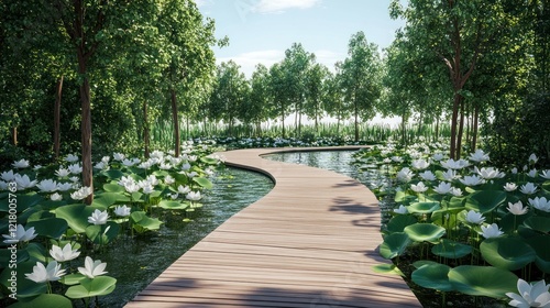 Serene boardwalk path curves through lush forest, water lilies bloom, sunny day