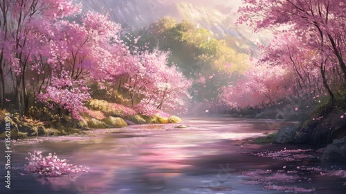Serene Cherry Blossom River Scenery with Pastel Hues and Gentle Flow