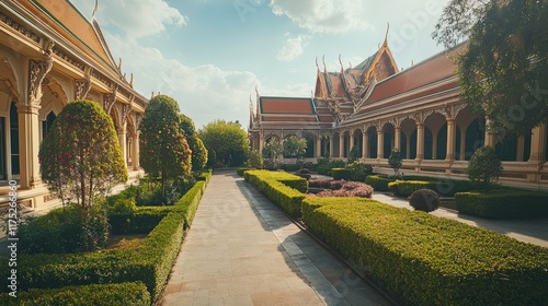 Serene Courtyard Garden With Traditional Thai Temple Architecture