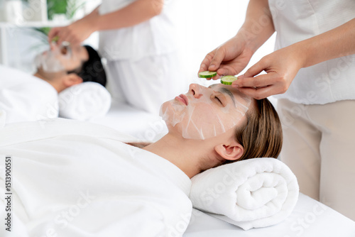 Serene daylight ambiance of spa salon, couple customer indulges in rejuvenating with luxurious cucumber facial mask. Facial skincare treatment and beauty care concept. Quiescent