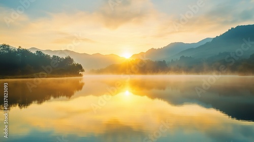 Serene Early Morning in Misty Hills Surrounded by Calm Nature