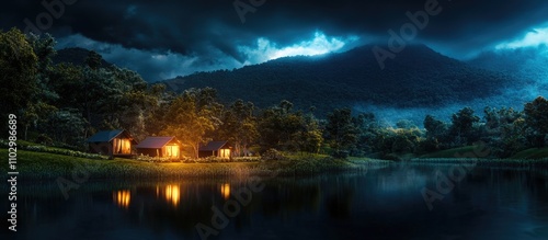 Serene eco glamping site by a tranquil lake surrounded by lush trees under a dramatic night sky capturing sustainable tourism essence