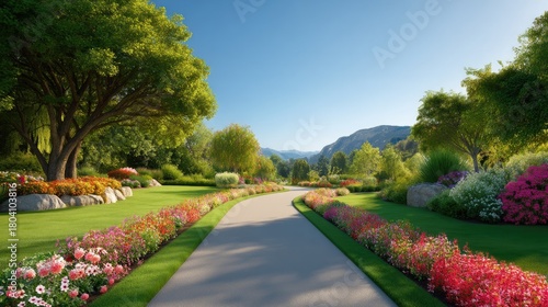 Serene Garden Pathway Surrounded by Vibrant Flowers and Lush Green Landscape in a Bright Daylight Setting with Mountains in the Background