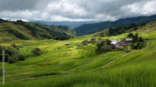 Serene Green Rice Terraces Mountain Village Landscape Scenic View Lush Fields Tranquil Nature Asian Countryside Rural Homes Picturesque Scenery Breathtaking Panorama Beautiful Hills Verdant Valley