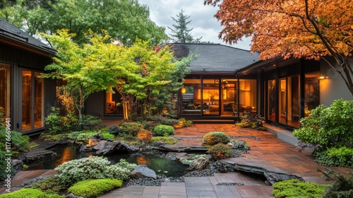 Serene Japanese Garden at Dusk: Tranquil Courtyard Oasis