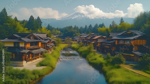 Serene Japanese Village Beside River With Mount Fuji In Background