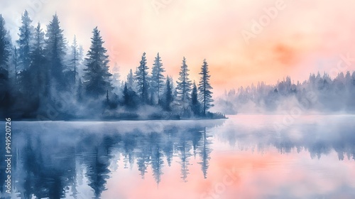Serene lake at sunrise with mist rising and pine trees watercolor pastel tones