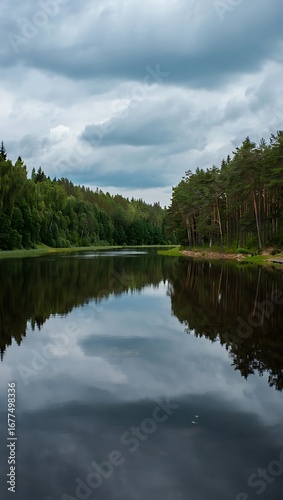Serene lake reflecting dramatic cloudy sky amidst lush forest landscape