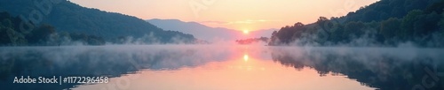 Serene lake surface reflected with misty dawn, morning, water