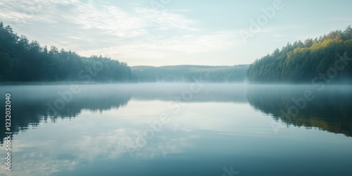 Serene lake view capturing morning mist and tranquil reflections on calm water.