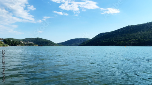 Serene landscape featuring calm blue water reflecting the sky, surrounded by lush green hills under a bright sunny day, creating a peaceful natural environment