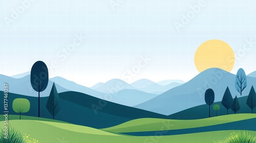 Serene Landscape Illustration with Gentle Hills and Rising Sun