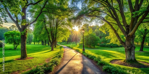 Serene Landscape Path Through Lush Green Park Surrounded by Trees and Vibrant Nature's Beauty