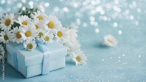 Serene light bathes delicate daisies adorning a pastel blue gift box. AI Generated