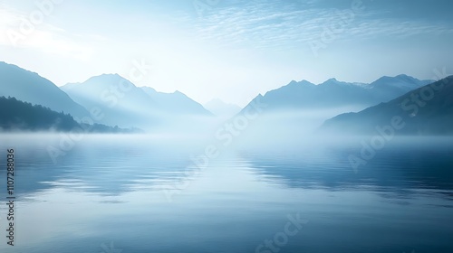 Serene misty lake surrounded by mountains, reflecting tranquility and natural beauty.