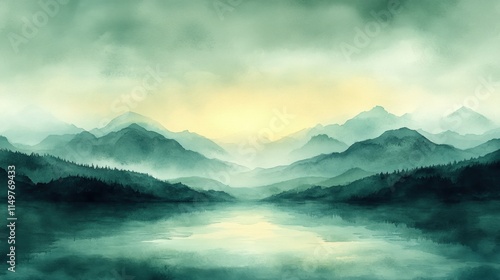 Serene misty mountain lake landscape at sunrise.