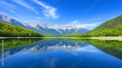 Serene Mountain Lake Reflection Under a Blue Sky
