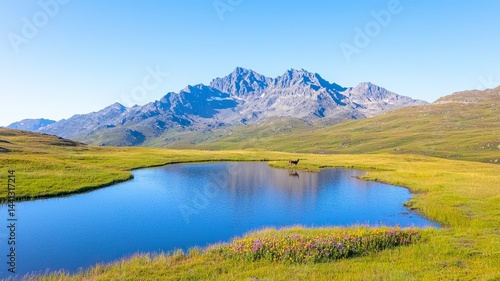 Serene Mountain Lake With Mountain Reflection Under Bright Sunlight