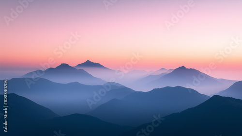 Serene mountain landscape at sunset with soft pastel colors and misty layers. tranquil scene evokes sense of peace and natural beauty.