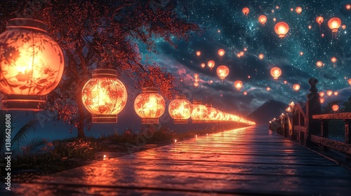 Serene Nightscape with Lanterns and Starry Sky Over a Pier