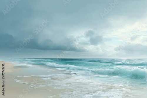 Serene Ocean Waves and Cloudy Sky Over Tranquil Beach Scene