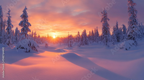 serene panoramic view of a snowy winter landscape at sunset in Saariselka, Lapland, Finland. Frozen trees glisten under the soft orange light, symbolizing peace, tranquility, and the cold beauty of wi
