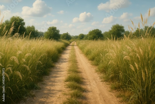 Serene Pathway Through Grassy Fields Under a Clear Blue Sky