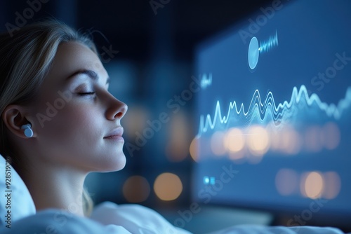 Serene Sleep Technology: Person Using Wearable Sleep Tracker with Calming Wave Visualization in Bedroom Setting