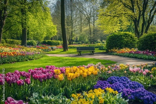 Serene spring park with colorful tulips and bench.