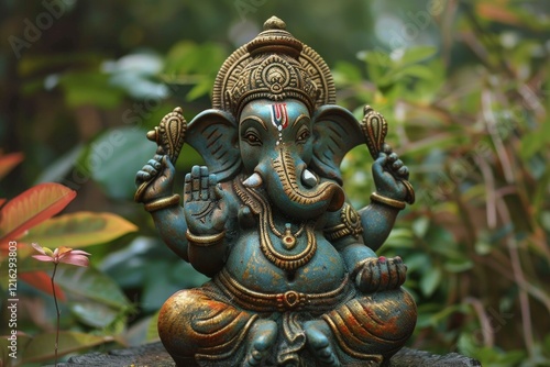 Serene statue of ganesha placed in a vibrant garden, embodying peace and spirituality