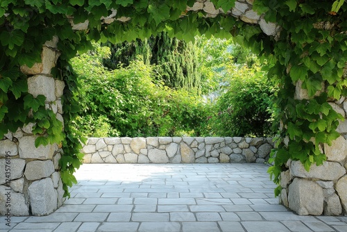 Serene Stone Archway Surrounded by Lush Greenery in Bright Setting