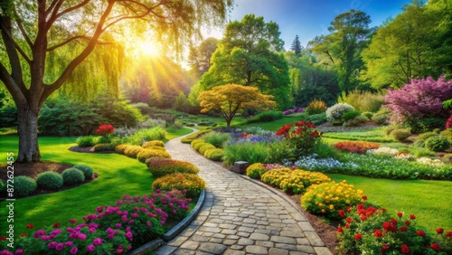 Serene sunny afternoon landscape of a lush green park with a winding stone path and vibrant blooming flowers everywhere.