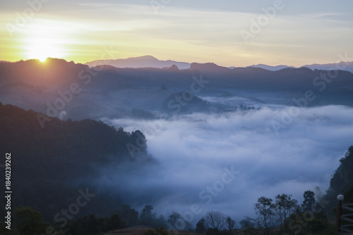 Serene sunrise over beautiful mountain landscape. Morning light illuminates tranquil valley filled with dense sea of fog creating peaceful and majestic view of nature