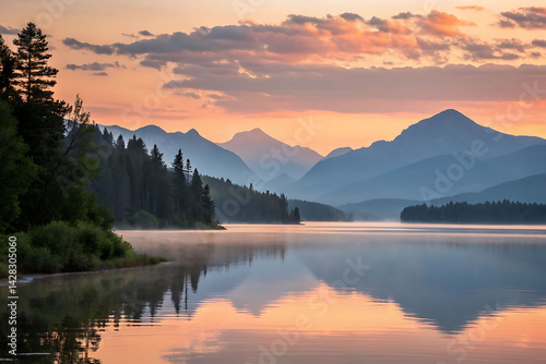 Serene Sunrise over Misty Mountain Lake