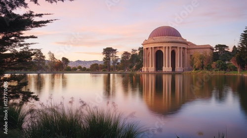 Serene sunset, domed structure reflected in calm lake.