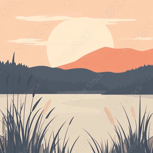 Serene Sunset Lake Landscape: Calm Water, Mountains, and Reeds