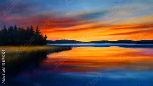Serene Sunset Landscape Painting Vibrant Colors Reflecting on Calm Lake Water