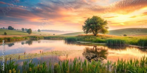 Serene Sunset Landscape Tranquil Pond Reflecting Colorful Sky, Solitary Tree on Gentle Hill, Lush Meadow, Calm Water, Peaceful Nature Scene