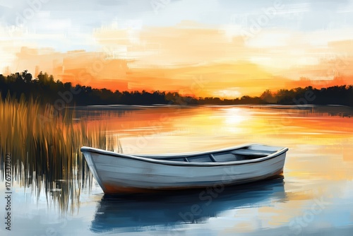 Serene Sunset Over a Tranquil Lake with Boat