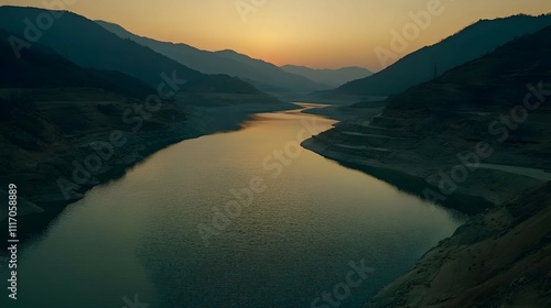 Serene sunset over a tranquil river valley, nestled between mountains.