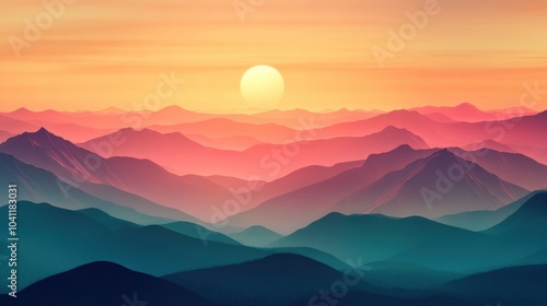 Serene sunset over layered mountain ranges in soft hues.